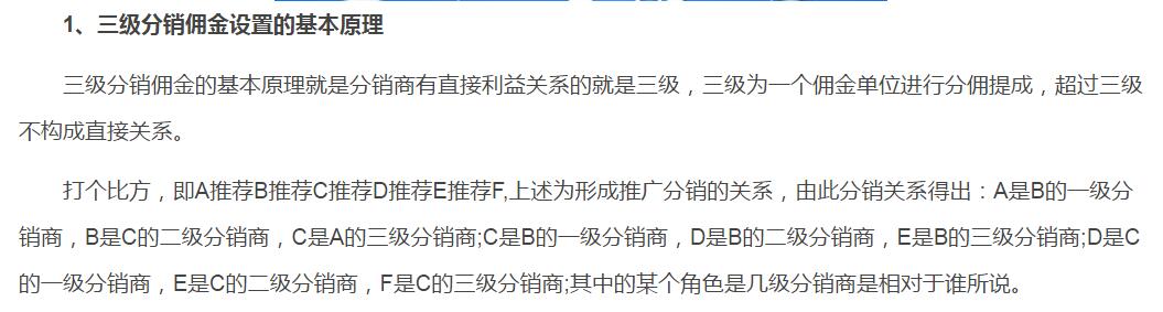 今天有客户让魅力网络解释什么是三级分销及如何用的,用的是微擎的人人商城程序,人人商城功能比较强大,客户用的是小程序也带分销,分销的问题看网上没有一个明白的说明,今天魅力网络就透彻的讲解一下,有说明不明白的可以加我QQ1632665886 分销模式分为普通三级分销 和分销内购 先说说普通分销 普通分销模式: 比如设置佣金比例是 一级15% 二级8% 三级5% 比如A是我 那么B是我的一级分销商 C是我的二级分销商 D是我的三级分销商 E F也就和我没关系了 对于C来说 D是C的一级分销商 D是B的二级分销商 E是B的三级分销商 F和AB没有关系 A是我 如果B购买了 我的佣金是15% C购买了佣金是8% D购买了佣金是5% 如果BCD他们个买了一件那佣金如下 A:佣金是15%+8%+5% B:佣金就是:15%+8% 参考资料百度文库 参考资料https://www.wxfenxiao.com/Article/artdetail/ai/2064 |