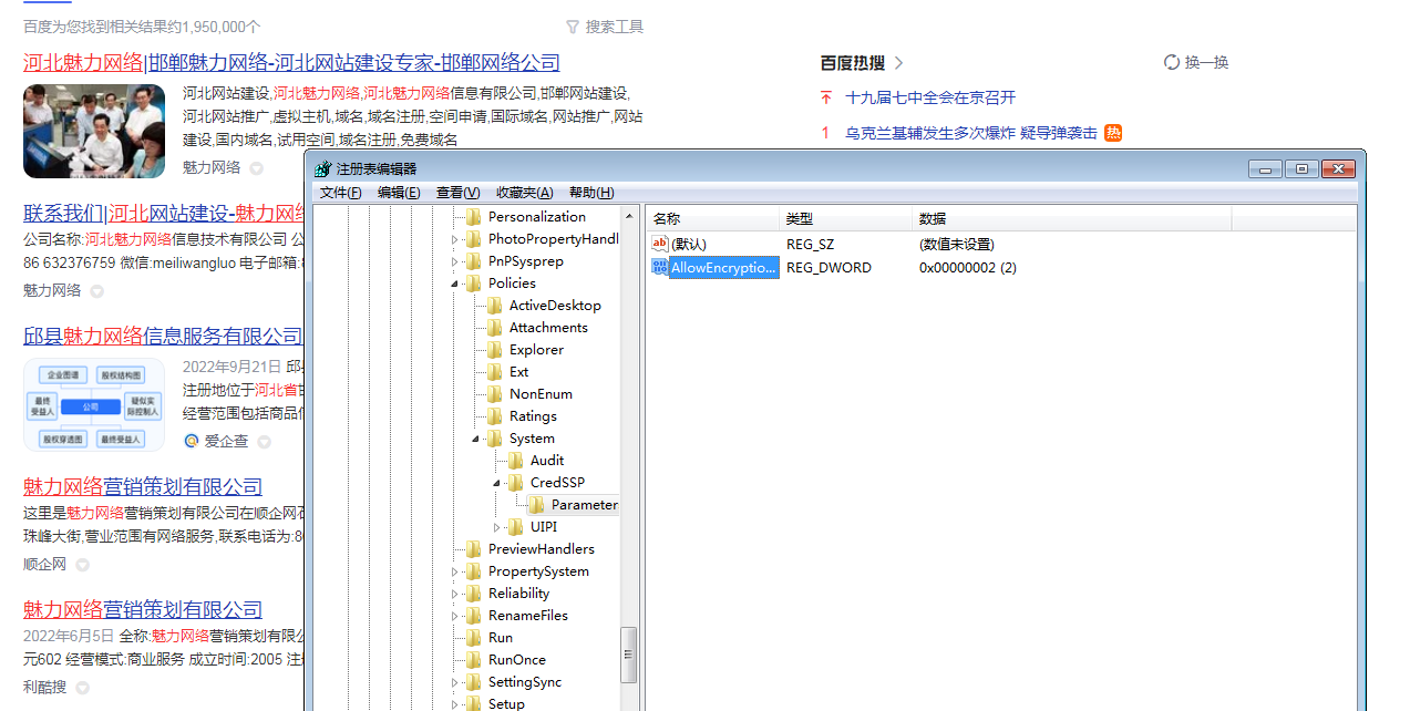 然后在最底部文件夹Parameters里面,新建 DWORD(32)位值(D)-----文件名 “AllowEncryptionOracle” ,值 : 2. 这样再连接远程服务器就可以连接了 |